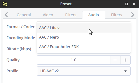 Support has been added to Selene for encoding audio with FFmpeg’s AAC encoder and the Fraunhofer FDK AAC encoder (libfdk_aac). Using Nero AAC is not recommended anymore as development seems to have stopped. libfdk_aac gives better quality and can be easily installed from the Ubuntu repositories. Install the libfdk-aac0 package on your Ubuntu system to get the encoder.